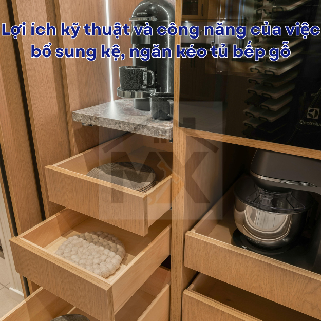 I. Phân tích chuyên sâu: lợi ích kỹ thuật và công năng của việc bổ sung kệ, ngăn kéo tủ bếp gỗ
