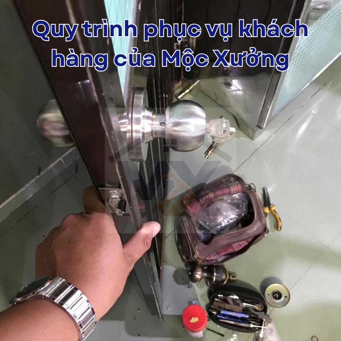 Đội ngũ thợ mộc lành nghề của Mộc Xưởng sẽ tiến hành sửa chữa hoặc thay mới khóa một cách cẩn thận và chính xác, sử dụng các dụng cụ chuyên dụng và tuân thủ các tiêu chuẩn kỹ thuật.