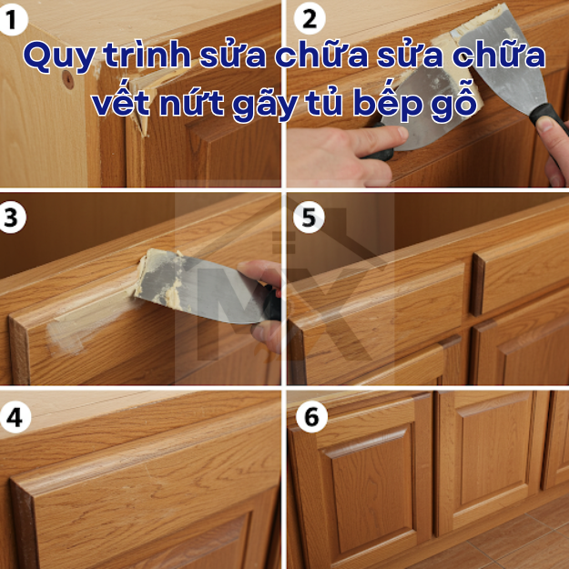 Vật liệu sửa chữa tương thích: Sử dụng các loại keo, bột gỗ và vật liệu gia cố có độ tương thích cao với loại gỗ của tủ bếp để đảm bảo độ bền và tính thẩm mỹ sau sửa chữa.