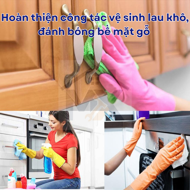 Kết hợp tác động cơ học và hóa học: Khăn mềm, miếng bọt biển không mài mòn và các bàn chải mềm được sử dụng kết hợp với dung dịch tẩy rửa để nhẹ nhàng loại bỏ các vết dầu mỡ cứng đầu, đảm bảo không gây trầy xước hoặc làm hỏng lớp phủ bề mặt gỗ.