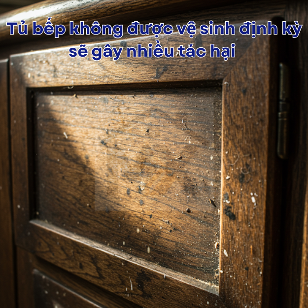Suy giảm thẩm mỹ: Sự tích tụ của bụi bẩn và dầu mỡ tạo ra một lớp màng xỉn màu, làm mất đi độ bóng tự nhiên và làm nổi bật các khuyết điểm trên bề mặt gỗ, ảnh hưởng đến vẻ đẹp tổng thể của không gian bếp.