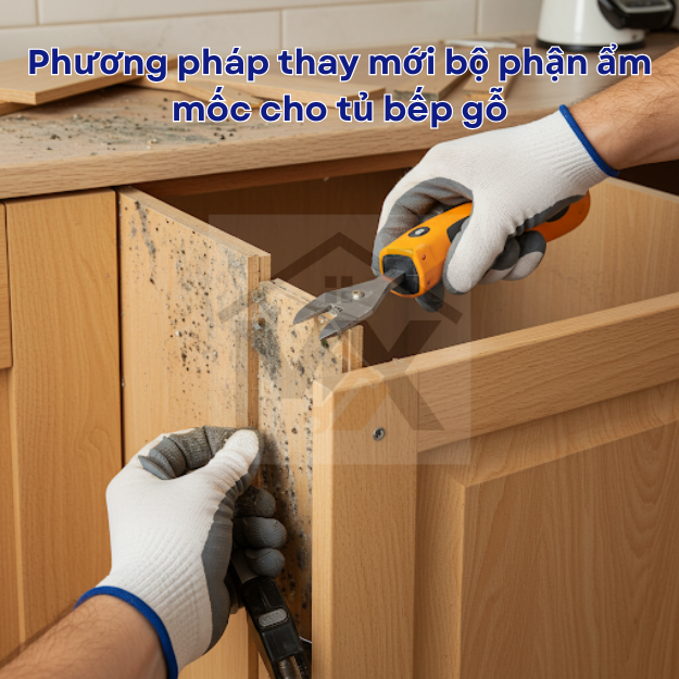 Bước 3: Chuẩn bị khu vực và triển khai biện pháp xử lý: Tiến hành che chắn và bảo vệ các khu vực xung quanh tủ bếp để tránh bị ảnh hưởng trong quá trình xử lý. Thực hiện các biện pháp loại bỏ nấm mốc, làm khô gỗ, xử lý các vùng bị mục nát theo phác đồ đã được thống nhất.