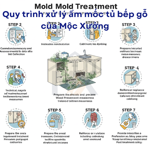 Mộc Xưởng áp dụng một quy trình đa giai đoạn và các phương pháp chuyên biệt để xử lý triệt để các vấn đề về ẩm mốc, thấm nước và mục nát gỗ tủ bếp: