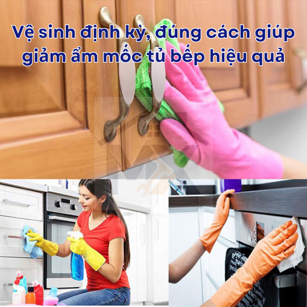 – Kiểm soát nguồn nước: Khắc phục ngay lập tức mọi rò rỉ nước từ đường ống, vòi nước hoặc các thiết bị khác trong bếp. Tránh để nước đọng trên bề mặt tủ bếp.